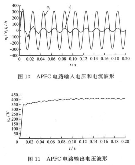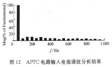 單相APFC電路采用Matlab7.6進(jìn)行建模與仿真。圖10為APFC電路輸入電壓和電流波形,可見網(wǎng)側(cè)輸入電流由窄脈沖波形變成正弦電流波形,且與輸入電壓同相位。圖11為APFC電路輸出電壓波形,可見經(jīng)過(guò)60ms的軟啟動(dòng)過(guò)程之后,輸出電壓穩(wěn)定在400V左右,滿足設(shè)計(jì)要求。圖12為APFC電路輸入電流諧波分析結(jié)果,可見除基波外,其余諧波含量均很小?! ?/p>