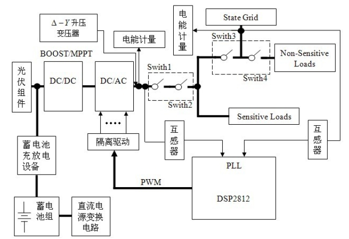 微網(wǎng)逆變器系統(tǒng)將可再生能源(如太陽能,風(fēng)能,水能,地?zé)崮埽镔|(zhì)能等)轉(zhuǎn)變?yōu)榕c電網(wǎng)同頻、同相的交流電,優(yōu)先輸送給當(dāng)?shù)刎?fù)荷供電,剩余的電能饋入電網(wǎng)。微網(wǎng)逆變器系統(tǒng)主要包括:光伏組件,蓄電池組,蓄電池充放電設(shè)備,DC/DC 變換器,微網(wǎng)逆變器,靜態(tài)開關(guān)等。
