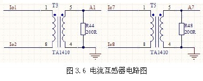 此系統(tǒng)輸出電流小于1A,故選擇最大可以測量1A 的電壓型電流互感器TA1410,負(fù)載電阻用是200歐,輸出電壓為-1~1V 的交流電壓。電路如圖3.6 所示。