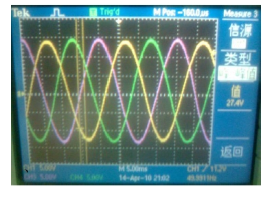 光伏并網(wǎng)發(fā)電系統(tǒng)要實現(xiàn)并網(wǎng),必須使逆變輸出與電網(wǎng)電壓的幅度、相位與頻率達(dá)到一致,否則將會使電網(wǎng)諧波增加、電能質(zhì)量下降,并產(chǎn)生并網(wǎng)環(huán)流,甚至造成光 伏發(fā)電系統(tǒng)的損壞。因此在并網(wǎng)過程中必須進(jìn)行同步鎖相控制、輸出電壓幅度控制以滿足并網(wǎng)的要求。根據(jù)IEEE Std 1547-2003 規(guī)定最大相位誤差為20 度,瞬時電壓誤差不能超過電網(wǎng)電壓的10%、最大頻率誤差不能超過0.3Hz。圖片4-1為獨立工作模式時純電阻負(fù)載兩端的電壓波形。