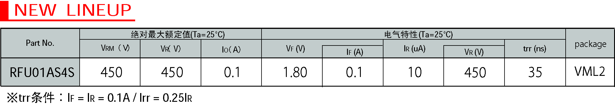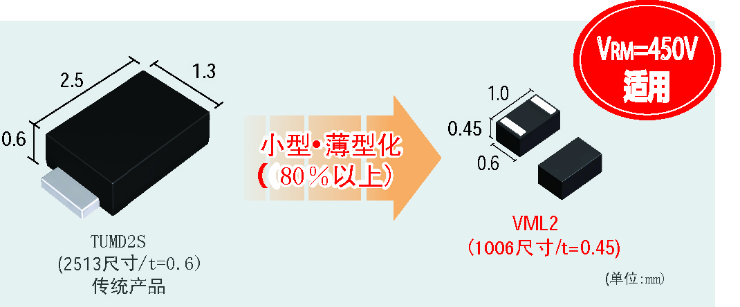 這次,羅姆通過改善結(jié)構(gòu)設(shè)計和裝配工藝使封裝得到優(yōu)化,成功開發(fā)出了世界最小的“VML2”封裝(1006尺寸∶1.0mm×0.6mm)快速恢復(fù)二極管。與傳統(tǒng)的2513尺寸(2.5mm×1.3mm)相比,體積減少約86%。不僅體積小巧,高達(dá)450V耐壓特性也是其特長之一。