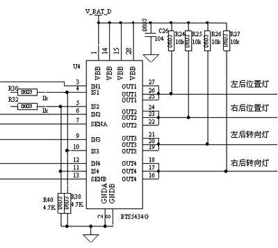智能車燈控制系統(tǒng)由轎車中12V低壓大電流系統(tǒng)供電,通過MCU控制Infineon智能功率開關實現(xiàn)上述所有功能。在這套為以ROVER平臺開發(fā)的燈控系統(tǒng)中使用了Infineon新一代的芯片:BTS6142D和BTS5434G等。