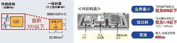 本產(chǎn)品融合了羅姆獨(dú)創(chuàng)的BiCDMOS技術(shù)與新開(kāi)發(fā)的片上變壓器工藝技術(shù),作為內(nèi)置了絕緣元件的柵極驅(qū)動(dòng)器,是業(yè)界最小※的小型封裝,有助于逆變器電路的小型化。另外,與傳統(tǒng)的光耦方式相比,可大幅降低耗電量,而且由于具備了所有必要的保護(hù)功能和品質(zhì)要求,可減少設(shè)計(jì)時(shí)的工作量。