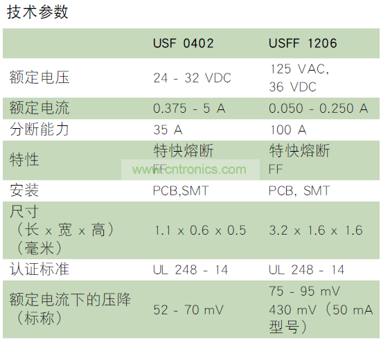 這兩款保險絲都經(jīng)過精心的開發(fā)設(shè)計,專用于為次級電路提供過流保護。 USF 0402 的額定電流范圍為 375 mA 至5 A,額定電壓為 32 VDC(最大 4 A)和 24 VDC(最大 5A)。 分?jǐn)嗄芰κ窃陬~定電壓下為 35 A。 USFF 1206 的額定電流較小,其額定電流范圍為 50 至 250 mA,額定電壓為 63 VDC,分?jǐn)嗄芰?100 A。