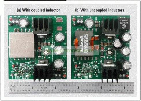 圖 2 顯示了使用一個(gè)耦合電感的原型 SEPIC的 示意圖。若想在設(shè)計(jì)中實(shí)施非耦合電感,只需在相同 PWB 上用兩個(gè)電感替換耦合電感便可。圖 3 顯示了兩種原型電路。圖 3b 中,L1 占用了耦合電感的空間,而 L2 則位于右上角。