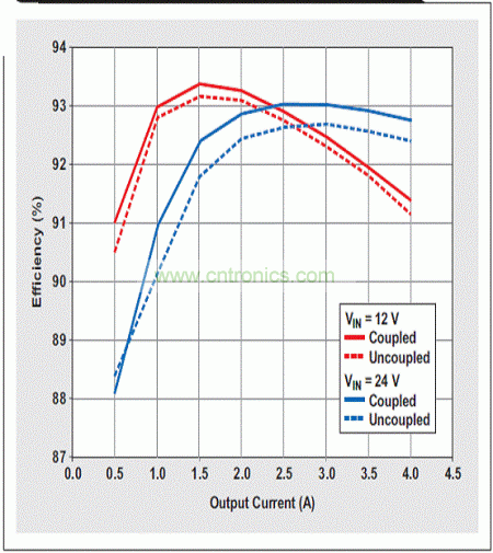 圖 4 耦合和非耦合電感均獲得了較好的效率