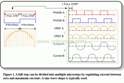 圖 1 通過調(diào)節(jié)零和最大電流之間的電流,我們可以將一個(gè)全步分成多個(gè)微步。一般會(huì)使用一個(gè)正弦波形。