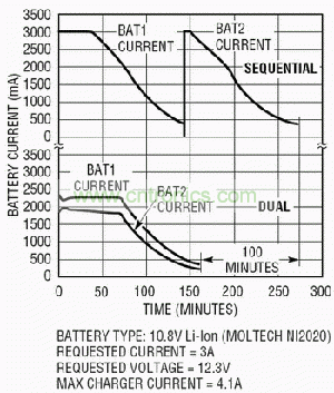 傳統(tǒng)上,雙電池系統(tǒng)是順序放電系統(tǒng),允許順序消耗電池電量(先消耗電池1,再消耗電池2),以簡單地延長總的電池工作時間。LTC1760采用了專有模擬控制技術,可允許安全地對兩個電池并行充電或放電。圖1是一個采用LTC1760的雙電池系統(tǒng)的簡化原理圖。這種結(jié)構(gòu)使充電速度提高了50%,電池工作時間延長了10%。此外,并行放電不僅增強了電流能力,而且還降低了I2R損耗并改善了在極高負載條件下的電壓調(diào)節(jié)能力。降低I2R損耗和改善電壓調(diào)節(jié)都延長了時序解決方案的總放電時間(見圖2)。