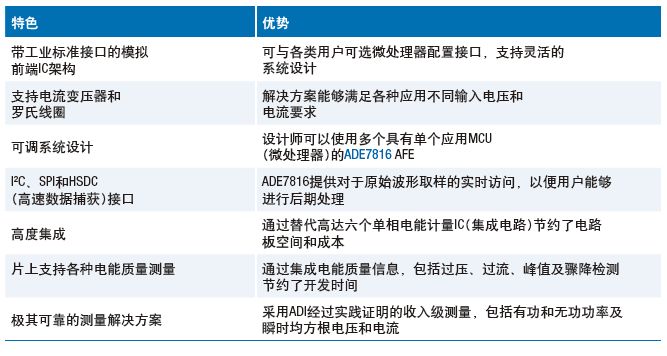 型ADC和一個(gè)高精度電能計(jì)量?jī)?nèi)核。六個(gè)電流輸入通道允許同時(shí)測(cè)量多個(gè)負(fù)載。電壓通道和各電流通道都具有完整的信號(hào)路徑,支持全范圍測(cè)量。各輸入通道均支持靈活的增益級(jí),因此該器件適合與各種電流傳感器一起使用,如電流變壓器(CT)和羅氏線(xiàn)圈。該器件包含6個(gè)片內(nèi)數(shù)字積分器為使用羅氏線(xiàn)圈傳感器提供了便利。ADE7816允許用戶(hù)通過(guò)SPI或I2C接口訪(fǎng)問(wèn)片內(nèi)計(jì)量寄存器。專(zhuān)用高速數(shù)據(jù)采集(HSDC)端口可以與I2C配合使用,以訪(fǎng)問(wèn)實(shí)時(shí)ADC輸出信息。通過(guò)兩個(gè)外部中斷引腳IRQ0和IRQ1可以獲得全面的電能質(zhì)量信息,如過(guò)流、過(guò)壓、峰值和驟降檢測(cè)等。ADE7816電能計(jì)量IC采用3.3 V電源供電,提供40引腳LFCSP無(wú)鉛封裝。