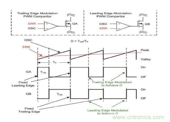 后沿脈寬調制比較器通過對比鋸齒電壓波形(OSC)和誤差電壓(ERR)來控制功率轉換器占空比(D)。一般,誤差電壓由一個反饋運算放大器控制。在后沿脈寬調制中,OSC引腳被饋送給脈寬調制比較器的負輸入,而誤差電壓則饋送至脈寬調制比較器的非反相輸入。脈寬調制比較器的輸出用于控制功率轉換器(QA)的FET柵極。該柵極驅動導通信號與OSC信號波谷同步。在這種配置結構中,F(xiàn)ET柵極驅動的后沿經(jīng)過調制,以達到功率轉換器占空比 (D)。該后沿為FET關斷時(請參見圖 1)。
