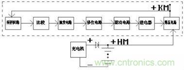 如圖2圖3示 ,合閘母線(+HM)經(jīng)過硅降壓回路降壓后,形成正控制母線(+KM),+KM經(jīng)自動調(diào)壓回路采樣后,采樣值送到比較判斷回路,在此處進(jìn)行比較。如果+KM沒有高于預(yù)先設(shè)好的范圍,則觸發(fā)電路不動作。移位執(zhí)行電路也不動作,相應(yīng)的繼電器也不動,電路保持原狀態(tài),+KM值保持不變,如果+KM超出了預(yù)先設(shè)好的范圍,則比較判斷回路發(fā)出信號,告之觸發(fā)電路,觸發(fā)電路立即發(fā)出脈沖,觸發(fā)移位寄存器,移位寄存器開始向左或向右執(zhí)行移位,從而使電路驅(qū)動繼電器動作。繼電器相應(yīng)的節(jié)點(diǎn)打開或閉和,來實現(xiàn)硅二極管是串入還是脫離+KM回路,于是實現(xiàn)+KM按電力標(biāo)準(zhǔn)規(guī)定的范圍內(nèi)變化,從而實現(xiàn)了自動調(diào)節(jié)+KM電壓。