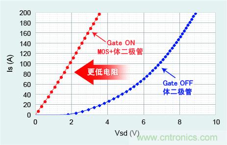一般Si-IGBT元件無法逆向?qū)?,而SiC-MOSFET可通過體二極管實現(xiàn)常時逆向?qū)āA硗?,通過輸入柵極信號,還可實現(xiàn)MOSFET的逆向?qū)ǎc二極管相比,可實現(xiàn)更低電阻。通過這些逆向?qū)ㄌ匦?,與二極管整流方式相比,可在1000V以上的范圍采用高效同步整流方式的技術。