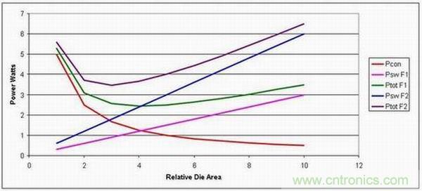 但是,在更高的工作頻率下,最佳裸片面積較小,從而帶來成本節(jié)約。實際上,在低頻率下,通過調整裸片面積來最小化損耗會帶來極高成本的設計。但是,轉到更高工作頻率后,我們就可以優(yōu)化裸片面積來降低損耗,從而縮小電源的半導體體積。這樣做的缺點是,如果我們不改進半導體技術,那么電源效率將會降低。