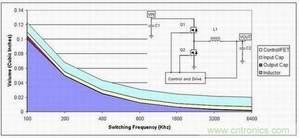 圖1顯示的是降壓電源頻率與體積的關系。頻率為100 kHz時,電感占據(jù)了電源體積的大部分(深藍色區(qū)域)。如果我們假設電感體積與其能量相關,那么其體積縮小將與頻率成正比例關系。由于某種頻率下電感的磁芯損耗會極大增高并限制尺寸的進一步縮小,因此在此情況下上述假設就不容樂觀了。如果該設計使用陶瓷電容,那么輸出電容體積(褐色區(qū)域)便會隨頻率縮小,即所需電容降低。另一方面,之所以通常會選用輸入電容,是因為其具有紋波電流額定值。該額定值不會隨頻率而明顯變化,因此其體積(黃色區(qū)域)往往可以保持恒定。另外,電源的半導體部分不會隨頻率而變化。這樣,由于低頻開關,無源器件會占據(jù)電源體積的大部分。當我們轉到高工作頻率時,半導體(即半導體體積,淡藍色區(qū)域)開始占據(jù)較大的空間比例。