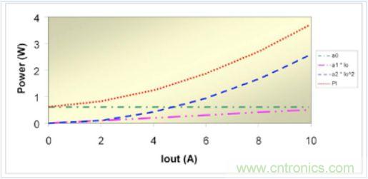 如果意識(shí)到電源損耗與輸出電流相關(guān)(可用輸出電流替換 X),那么系數(shù)項(xiàng)就能很好地與不同來(lái)源的電源功率損耗聯(lián)系起來(lái)。例如,ao 代表諸如柵極驅(qū)動(dòng)、偏壓電源和磁芯的固定開銷損耗以及功率晶體管 Coss 充電與放電之類的損耗。這些損耗與輸出電流無(wú)關(guān)。第二項(xiàng)相關(guān)聯(lián)的損耗 a1 直接與輸出電流相關(guān),其典型表現(xiàn)為輸出二極管損耗和開關(guān)損耗。在輸出二極管中,大多數(shù)損耗是由于結(jié)電壓引起的,因此損耗會(huì)隨著輸出電流成比例地增加。