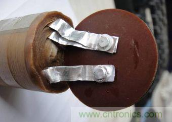 引腳我們行話叫導(dǎo)針,小型品都是刺鉚上去的,我們一般看上去會(huì)有整齊的一排小孔反面有整齊的4瓣花。這東西一定要整齊牢固,否則會(huì)出現(xiàn)很多問(wèn)題。比如接觸電阻大,內(nèi)阻大,無(wú)容量,紋波電流偏小等等問(wèn)題。嚴(yán)重的時(shí)候會(huì)因?yàn)殡娏鬟^(guò)大而燒毀。在這里,電容的容量取決于正箔的面積,負(fù)極是吸附再電解紙上的電解液,而負(fù)極箔是專門用來(lái)引出的。