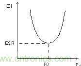由上式可知,電容器的阻抗不僅與電容量有關(guān),同時(shí)還與等效串聯(lián)電阻、雜散電感、系統(tǒng)頻率有關(guān)。其阻抗|Z|與頻率的關(guān)系曲線(xiàn)見(jiàn)圖2所示
