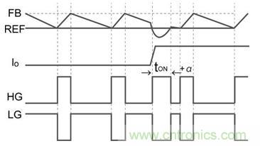 ●負(fù)載急劇變動(dòng)時(shí),輸出降低、過(guò)了FB引腳電壓所規(guī)定的tON時(shí)間還沒(méi)有上升到REF電壓以上時(shí),可通過(guò)延長(zhǎng)tON時(shí)間、供給更多的電力來(lái)加快輸出電壓的恢復(fù),即提高負(fù)載瞬態(tài)響應(yīng)特性;