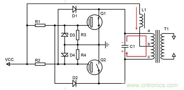 7. (圖3)由于T1對(duì)C1的持續(xù)充電,C1上電壓為a正c負(fù),通過兩個(gè)二極管使Q2柵極電壓升高,Q1柵極逐漸下降,同時(shí)正反饋形成,Q2導(dǎo)通,Q1截止。