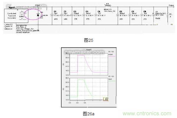 在ISO 7637-2:2004、GMW3100-08.2001:3.2.1.3等標(biāo)準(zhǔn)中規(guī)定了沿電源線的電瞬態(tài)傳導(dǎo)的干擾脈沖的抗擾性失效模式、嚴重程度和測量,提供了5 種典型脈沖波形,雖然沒有涵蓋所有可能出現(xiàn)在車輛上的各種瞬態(tài)脈沖,但適用于各種動力系統(tǒng)的道路車輛,例如:火花點火發(fā)動機、壓燃式發(fā)動機、電動機、混合動力驅(qū)動系統(tǒng)。針對這5種典型的瞬態(tài)傳導(dǎo)脈沖,在Saber仿真環(huán)境中進行該電源濾波器電路(圖13)的仿真如下: