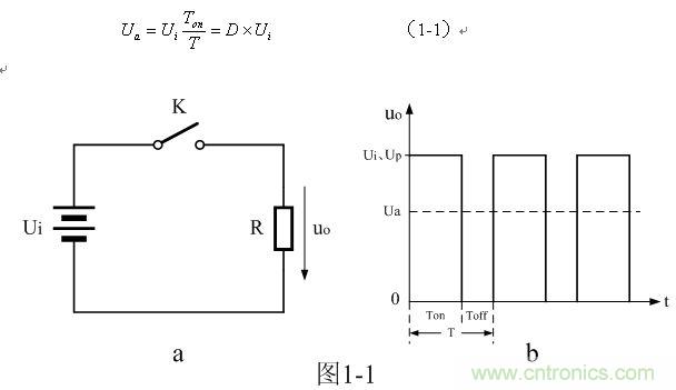 圖1-1-b是串聯(lián)式開關(guān)電源輸出電壓的波形,由圖中看出,從控制開關(guān)K輸出電壓uo是一個脈沖調(diào)制方波,脈沖幅度Up等于輸入電壓Ui,脈沖寬度等于控制開關(guān)K的接通時間Ton,由此可求得串聯(lián)式開關(guān)電源輸出電壓uo的平均值Ua為: