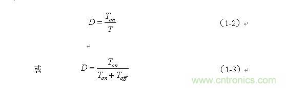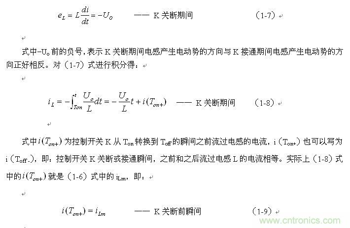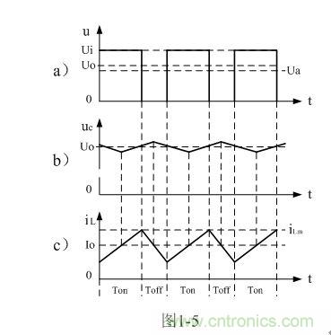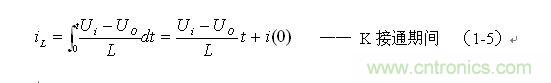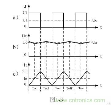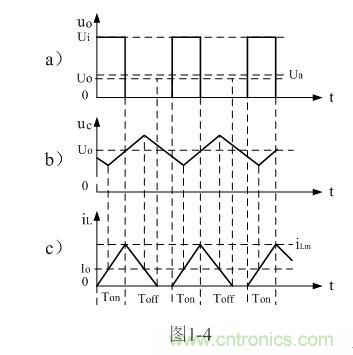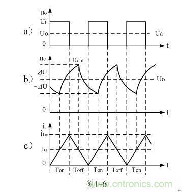 在此順便說明:由于電容兩端的電壓變化量ΔU相對于輸出電壓Uo來說非常小,為了簡單,我們這里把Uo當成常量來處理。在某種情況下,當我們需要對電容的初次充、放電過程進行分析時,必須需要建立微分方程,并求解。當開關(guān)電源剛開始工作時,由于輸出電壓Uo的建立需要一定的時間,因此,輸出電壓Uo的建立也需要一個過渡過程,如對此過渡過程進行精確計算,得出的結(jié)果中一般都含有一指數(shù)函數(shù)項,當令時間變量等于無窮大時,即電路進入穩(wěn)態(tài)時,再對相關(guān)參量取平均值,其結(jié)果就基本與(1-4)相等。