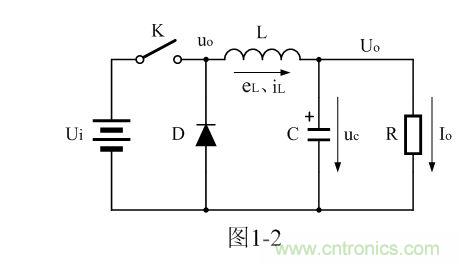 圖1-2中的C是儲能濾波電容,它的作用是在控制開關(guān)K接通期間Ton把流過儲能電感L的部分電流轉(zhuǎn)化成電荷進行存儲,然后在控制開關(guān)K關(guān)斷期間Toff把電荷轉(zhuǎn)化成電流繼續(xù)向負載R提供能量輸出,它對電感L的輸出電壓起到平滑濾波的作用,使輸出到負載兩端電壓的紋波降低。