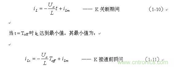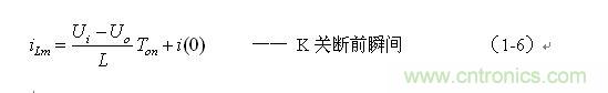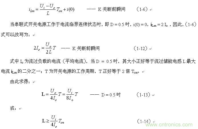 串聯(lián)式開關(guān)電源最好工作于電流臨界連續(xù)狀態(tài),或連續(xù)電流狀態(tài)。此時,開關(guān)電源輸出電壓的調(diào)整率為最好,且輸出電壓Uo的紋波也不大。因此,我們可以從電流臨界連續(xù)狀態(tài)著手進行分析。我們先看(1-6)式: