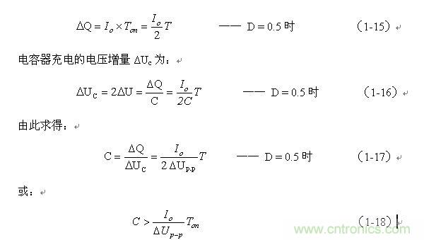 同理,(1-17)和(1-18)式的計算結(jié)果,只給出了計算串聯(lián)式開關(guān)電源儲能濾波電容C的中間值,或平均值,由于輸出電流的不確定性,實際應(yīng)用時,可以以此為極限,在此平均值的計算結(jié)果上再乘以一個大于1的系數(shù)。