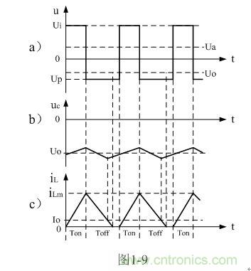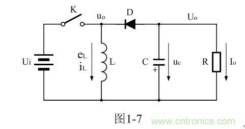 圖1-7中,Ui為輸入電源,K為控制開關(guān),L為儲能電感,D為整流二極管,C為儲能濾波電容,R為負載電阻。當控制開關(guān)K接通的時候,輸入電源Ui開始對儲能電感L加電,流過儲能電感L的電流開始增加,同時電流在儲能電感中也要產(chǎn)生磁場;當控制開關(guān)K由接通轉(zhuǎn)為關(guān)斷的時候,儲能電感會產(chǎn)生反電動勢,使電流繼續(xù)流動,并通過整流二極管D進行整流,再經(jīng)電容儲能濾波,然后向負載R提供電流輸出??刂崎_關(guān)K不斷地反復(fù)接通和關(guān)斷過程,在負載R上就可以得到一個負極性的電壓輸出。