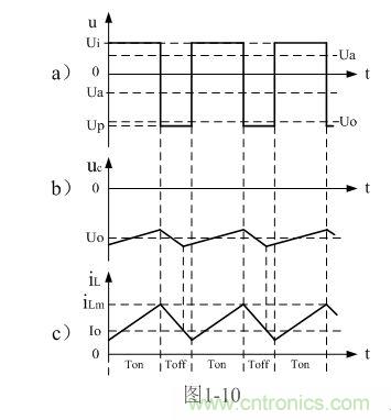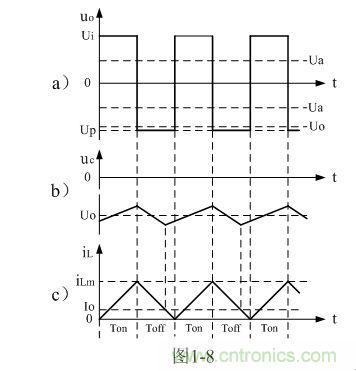 順便指出,反轉(zhuǎn)式串聯(lián)開關(guān)電源輸出電壓為負脈沖,當圖1-7中的濾波電容器C開路時,負脈沖的幅度將非常高,負脈沖是一個幅度按指數(shù)規(guī)律下降的尖脈沖,其幅度主要由負載電阻的大小,以及占空比來決定;當圖7中的濾波電容器C接入后,反轉(zhuǎn)式串聯(lián)開關(guān)電源輸出電壓uo為一負方波,此方波我們可稱之為半波平均值,關(guān)于半波平均值的概念我們后面還會詳細解釋。