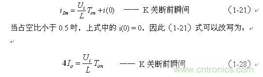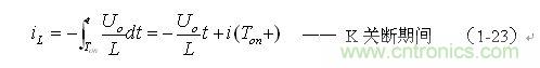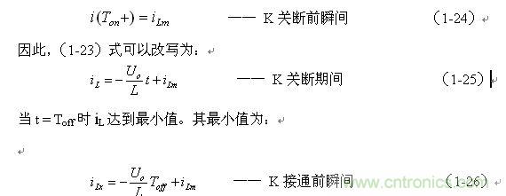 上式中i(Ton+)為控制開關(guān)K從Ton轉(zhuǎn)換到Toff的瞬間流過電感的電流,i(Ton+)也可以寫為i(Toff-),即:控制開關(guān)K關(guān)斷或接通瞬間,之前和之后流過電感L的電流相等。實際上(1-23)式中的i(Ton+)就是(1-21)式中的iLm,即: