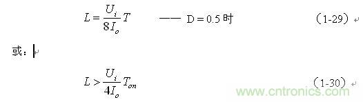 (1-29)和(1-30)式,就是計算反轉(zhuǎn)式串聯(lián)開關(guān)電源中儲能電感的公式。同理,(1-29)和(1-30)式的計算結(jié)果,只給出了計算反轉(zhuǎn)式串聯(lián)開關(guān)電源儲能電感L的中間值,或平均值,由于輸出電流的不確定性,實際應(yīng)用時,可以以此為極限,在此平均值的計算結(jié)果上再乘以一個大于1的系數(shù)。