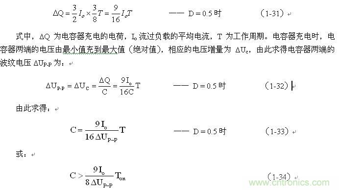 (1-33)和(1-34)式,就是計算反轉(zhuǎn)式串聯(lián)開關(guān)電源儲能濾波電容的公式(D = 0.5時)。式中:Io是流過負載電流的平均值,T為開關(guān)工作周期,ΔUP-P為濾波輸出電壓的波紋。一般波紋電壓都是取峰-峰值,因此,當D = 0.5時,波紋電壓正好等于電容器充電的電壓增量,即:ΔUP-P = ΔUc 。