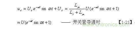 【1-21】式是當電源開關管Q1導通時,分布電容Cs兩端電壓隨時間變化的表達式,它由兩部分電壓組成,一部分是電容Cs兩端電壓的半波平均值Uc ,由【1-19】式表示;另一部分是正弦阻尼振蕩,其最大振幅等于 Uc, e-at是一個小于1的衰減系數(shù)。