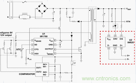 圖8 為基于Dialog 公司2014年初推出的iw620+iw1760的快速充電設(shè)計方案實(shí)物圖,電路的設(shè)計思路為iW620快速充電接口IC可以通過USB數(shù)據(jù)線檢測到支持Quick Charge 2.0的移動設(shè)備發(fā)出的指令,然后與iW1760 PWM原邊控制器進(jìn)行通信,對電源適配器輸出電壓進(jìn)行配置。位于初級側(cè)的iW1760就可提供電流感應(yīng)。通過其可編程的主動快速放電專利技術(shù)能將輸出電壓從9V或12V降至5V, 因此,當(dāng)用 戶拔掉連接Quick Charge 2.0手機(jī)的USB數(shù)據(jù)線,再將其連接至非Quick Charge 2.0手機(jī)時,iW620可以迅速把輸出電壓降至5V,避免對其造成損壞。