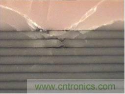 如圖3所示,斷裂通常沿著一層或兩層介質(zhì)層貫穿整個(gè)電容的中部。大多數(shù)的解決方案是將多個(gè)電容器通過(guò)添加引腳進(jìn)行疊加,從而在給定尺寸下提高容值,但這需 要消耗大量人力,花費(fèi)較多成本,并會(huì)產(chǎn)生可靠性問(wèn)題。另外的解決方案使用特殊電介質(zhì)配方,但同時(shí)以犧牲介電常數(shù)作為代價(jià),并影響最終可獲得的容值大小。