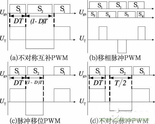 控制型軟開(kāi)關(guān)半橋DC/DC變換器不增加主電路元器件(可增加電感電容元件以實(shí)現(xiàn)軟開(kāi)關(guān)條件),通過(guò)合理設(shè)計(jì)控制電路來(lái)實(shí)現(xiàn)軟開(kāi)關(guān)。圖1給出4種控制型軟開(kāi)關(guān)半橋DC/DC變換器的PWM控制策略。