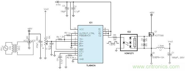 這里嘗試在開關(guān)穩(wěn)壓器中使用了光電耦合器(VOM1271),該耦合器具有一個內(nèi)置的快速關(guān)斷器件。如果將200pF柵極電容連接至IC2,則開關(guān)時間(ton與toff)分別為53μs和24μs。有鑒于此,降壓轉(zhuǎn)換器選擇了2kHz的開關(guān)頻率。此處選用了德州儀器(TI)的TL494(IC1)作為脈沖調(diào)制控制器。