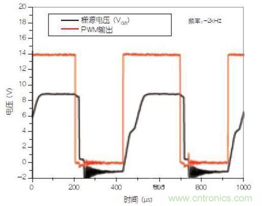 可以看到,盡管toff足夠快,但ton仍約為80μs。對于許多開關(guān)應(yīng)用來說,這個開啟過程是較慢的。若將開關(guān)頻率設(shè)置為2kHz,應(yīng)該不會導(dǎo)致太多開關(guān)損耗,對于PWM占空比較大的負載條件來說更是如此。