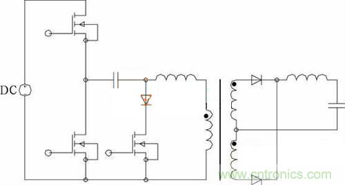 對稱式PWM 控制ZVS半橋變換器(見圖1),其與傳統(tǒng)半橋電路相比,對稱PWM 控制的ZVS直流變換器增加了一個由輔助開關(guān)管和一個二極管組成的支路。其主開關(guān)管不僅工作在對稱狀態(tài),而且下管和輔助開關(guān)管可在全負載范圍內(nèi)實現(xiàn) ZVS,上管也能在寬負載范圍內(nèi)實現(xiàn)ZVS,引起的附加損耗很小。該變換器器件所受應(yīng)力小,可靠性高,其更適合采用MOSFET做開關(guān)管,較少應(yīng)用于高電壓、大功率場合。該變換器需要利用諧振電感的儲能來實現(xiàn)開關(guān)管的ZVS,增大諧振電感能擴大上管ZVS范圍,但會使占空比丟失嚴重,設(shè)計諧振電感時須權(quán)衡考慮實現(xiàn)上管ZVS和減小占空比丟失。