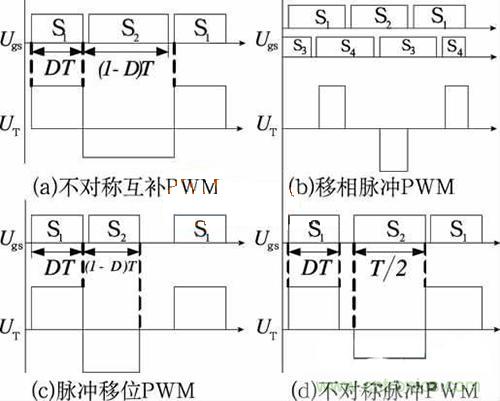 下面我們來具體說一下控制型軟開關(guān)PWM控制策略,它是指控制型軟開關(guān)半橋DC/DC變換器不增加主電路元器件(可增加電感電容元件以實現(xiàn)軟開關(guān)條件),通過合理設(shè)計控制電路來實現(xiàn)軟開關(guān)。圖2給出4種控制型軟開關(guān)半橋DC/DC變換器的PWM控制策略。