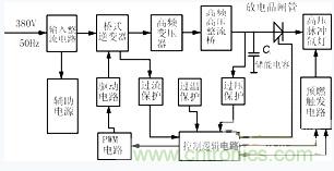 圖1示出電源原理框圖,整個電路可分為主電路(電力變換電路)和控制電路兩大部分。來自電網(wǎng)的380V交流電壓經(jīng)整流濾波后得到約520V左右的直流電壓,加到橋式逆變器上。逆變器主功率開關(guān)采用三菱公司的CT60型IGBT管。PWM電路產(chǎn)生一對相位互差180°的脈沖電壓控制逆變橋的四個功率管,將直流電壓變換為高頻方波電壓,再經(jīng)高頻高壓整流橋得到高壓直流(約1400V),向儲能電容Co充電。電容Co上電壓充到預(yù)定值(1000V)后,控制電路發(fā)出信號,將放電晶閘管觸發(fā)導(dǎo)通,Co上電壓快速向負(fù)載氙燈釋放,激光器正常工作。