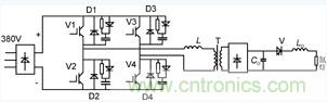 此處將限流電感L放在變壓器原邊。這除了能實(shí)現(xiàn)功率管的零電壓開通外,例如在V1,V4關(guān)斷后,由于L的續(xù)流作用,D2,D3導(dǎo)通,則V2,V3可實(shí)現(xiàn)零電壓開通;還可分擔(dān)變壓器原邊繞組上的壓降,減少變壓器匝數(shù),進(jìn)而減小變壓器磁心。