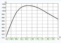 圖5中,橫坐標(biāo)表示變壓器副邊繞組匝數(shù)N2,縱坐標(biāo)表示輸出電壓U0,在L=100μH,Ui=520V,f=20kHz,N2=60時,輸出電壓U0為峰值。