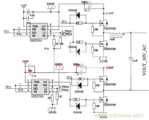 可以濾除載波頻率??紤]到MOS管需要相對較小的導通電阻RDS(on)和較小上升時間和下降時間的,本系統(tǒng)選用CSD19506。本系統(tǒng)需要驅(qū)動全橋,為了提高MOSFET的導通速度,降低開關損耗,因而選用TI提供的高速半橋驅(qū)動芯片UCC27211。圖2是全橋部分電路圖。