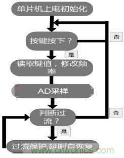 軟件結構框圖如圖1,主程序框圖如圖3。程序執(zhí)行的流程如下所述:單片機上電之后,系統(tǒng)進行按鍵、片上ADC12和LCD顯示屏初始化,程序查詢按鍵,若有相應按鍵按下,修改正弦波頻率,然后AD采樣電流判斷是否過流;否則返回繼續(xù)查詢按鍵。如果輸出過流,程序?qū)㈥P閉SPWM輸出,延時自恢復;否則返回按鍵查詢。