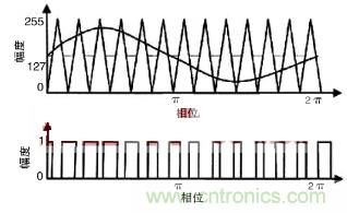 本系統(tǒng)采用自然采樣法產(chǎn)生SPWM波,以正弦波為調(diào)制波,等腰三角波為載波進行比較,在兩個波形的自然交點時刻控制開關器件的通斷。其優(yōu)點是所得SPWM波形最接近正弦波,但由于三角波與正弦波交點有任意性,脈沖中心在一個周期內(nèi)不等距,從而脈寬表達式是一個超越方程,若采用實時計算的方式得到SPWM波的話,計算繁瑣,非MSP430所能勝任。本系統(tǒng)充分利用MSP430的定時器,搭建了一個簡易的DDS;讓其計數(shù)器作增減計數(shù)構成三角波載波,再把正弦波表作為數(shù)組預先存入MSP430中,我們只需在定時器中斷中更新比較寄存器數(shù)值即可得到調(diào)制正弦波。由于MSP430定時器自帶比較功能,兩者比較即可得到SPWM波輸出,繼而撇開了繁瑣的超越方程求解。最終我們利用此方法得到的SPWM波濾波后的正弦波失真度達到了0.5%。圖4是自然采樣原理圖。