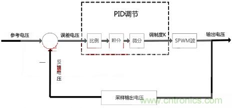由于輸入電壓隨著負載變大會有降低,切系統(tǒng)濾波電感具有電阻成分,這些因素導致在系統(tǒng)開環(huán)下負載調(diào)整率較大,因此本系統(tǒng)采用閉環(huán)反饋調(diào)整輸出電壓穩(wěn)定在10V。我們選用經(jīng)典PID反饋調(diào)整,對輸出電壓進行采樣,與參考電壓比較得到誤差電壓后進行位移式PID調(diào)節(jié),PID運算輸出作為SPWM的調(diào)制度K,與正弦波表相乘后形成新的波表進行生成SPWM波運算。用此方法后負載調(diào)整率降到了1%以下,圖5是反饋過程框圖。