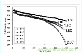 這是關于鋰離子電池充放電速率與其容量和循環(huán)壽命的關系圖,縱軸代表容量,橫軸代表循環(huán)壽命,由不同的點所描繪出來的曲線代表了用不同的速率對電池進行充放電時容量與循環(huán)壽命之間的關系。其中的C是與電池的容量有關的充放電速率數(shù)據(jù),假設某個電池的容量為1000mAH,如果用1000mA的電流對它進行充電或放電,則充滿或放完其全部電能的時間是一個小時,這時候的C就代表1000mA,2C則代表2000mA。根據(jù)這些定義,這個圖告訴我們如下信息:這個電池的初始容量為900mAH,假如用1C即900mA的電流對它進行充放電,經過500個循環(huán)后,其容量還剩下大約780mAH;如果用2C即1800mA的電流對它進行充放電,則經過500個循環(huán)后,其容量會下降到大約500mAH。